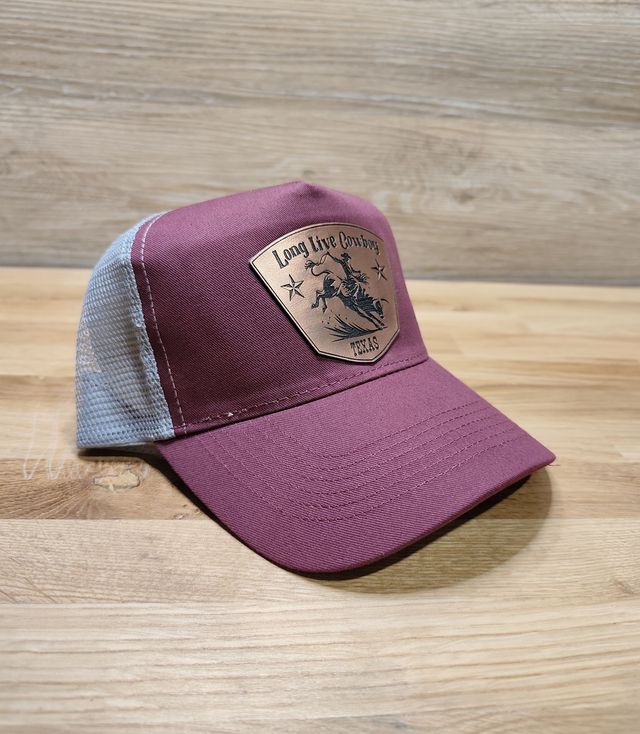 Casquette Trucker Bordeaux – Filet Gris & Patch Cuivré “Long Live Cowboy”